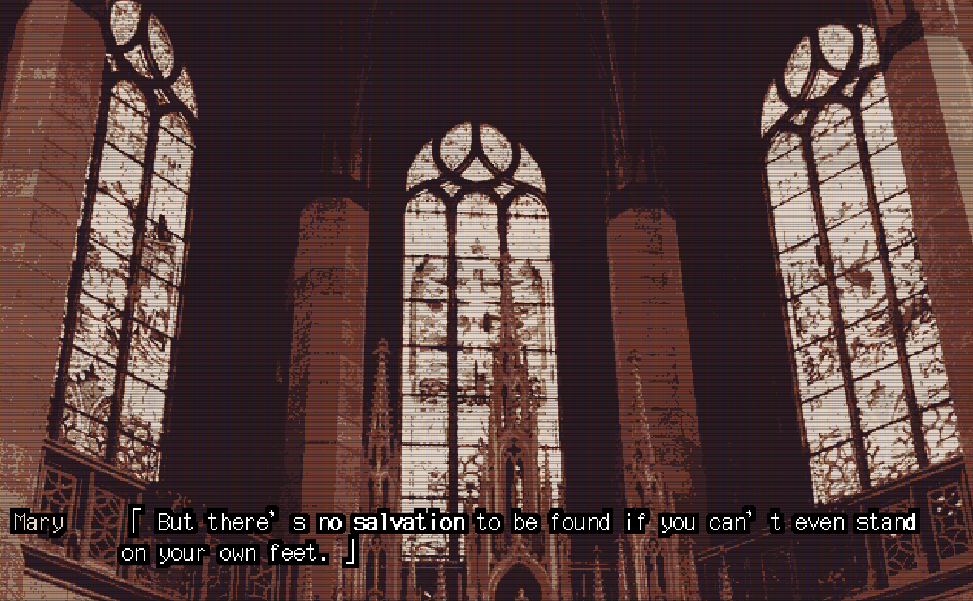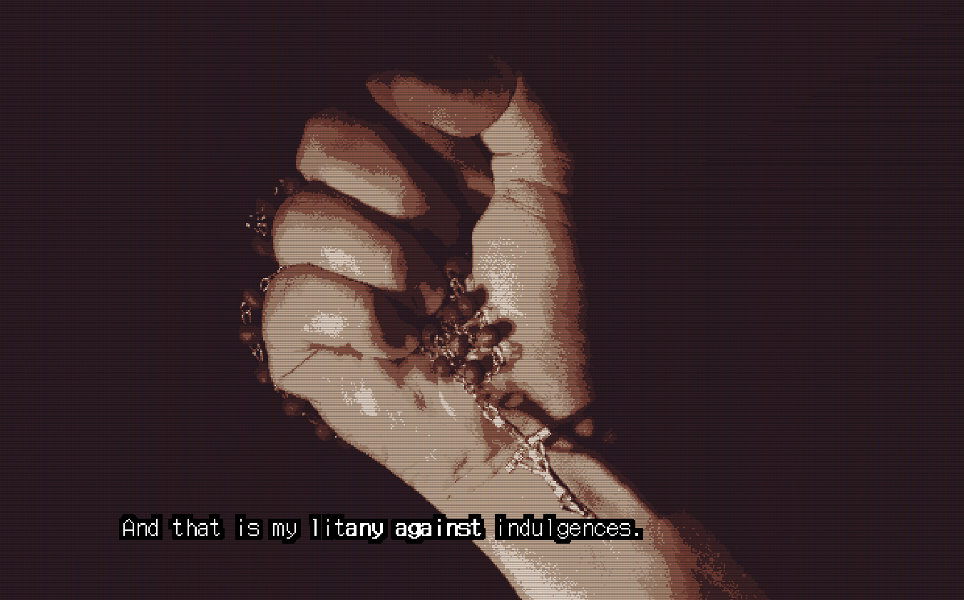 I thought this was really unique and explored its themes in a really interesting and evocative way. Since playing the game I haven't been able to stop thinking about it. The connection between protestant fruitless search for some kind of purity, the ultimately self serving penance of prayer etc and the juxtaposition with certain online trans space neuroses was actually genius. I also really like the visual and audio presentation with the different 'timelines' if u will being colourcoded, and the use of a dog clicker sfx was a nice touch. Really fantastic narrative game.